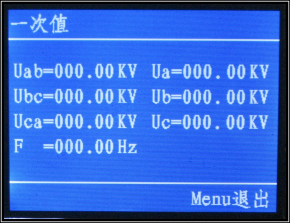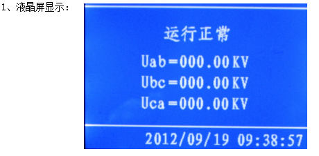 2、按键介绍: ‘菜单’键:按下此键,进入“ 菜”项,可查看参数显示、故障记录、参数调整子菜单。在二级菜单里,做为返回键使用。 ‘↑’键、‘↓’键、‘←’键、‘→’键:用于选择所需的功能项 ‘+’键、‘-’键: 用于修改数据; ‘确认’键: 确认当前的操作或进入下一级子菜单; ‘复位’键:按下此键可使装置重新启动。 注:所有菜单操作及说明在窗口下方的状态栏均有提示。 3、 指示灯状态: 运 行 灯: 装置正常运行时,灯亮,为闪烁状态; 谐 振 灯: 当系统发生谐振时,灯亮。 接 地 灯: 当系统发生接地时,灯亮。 过 压 灯: 当系统发生过电压时,灯亮。 低 压 灯: 当系统发生低电压时,灯亮。 4、继电器动作: 谐 振 继电器: 当系统发生谐振时,谐振继电器动作,常开接点闭合。 可以连接PTK使用。 接 地 继电器: 当系统发生接地时,接地继电器动作,常开接点闭合。 过 压 继电器: 当系统发生过电压时,过电压继电器动作,常开接点闭合。 低 压 继电器: 当系统发生低电压时,低电压继电器动作,常开接点闭合。 断 线 继电器: 当系统发生断线时, 断线继电器动作,常开接点闭合。 5、操作说明: 在运行界面按菜单键进入主菜单界面,如下图: